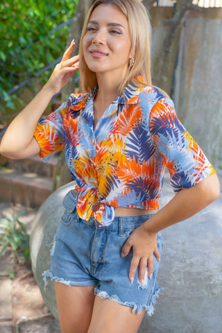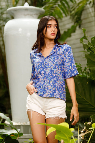 Make your Sunday brunch with friends a little more fun with this super cute and comfortable Ashley Short Sleeve Floral Top. Made from floral printed soft Georgette fabric featuring short sleeves and front covering button line. Add blue touched monotone silver earrings and beige sandals to look like an absolute doll.